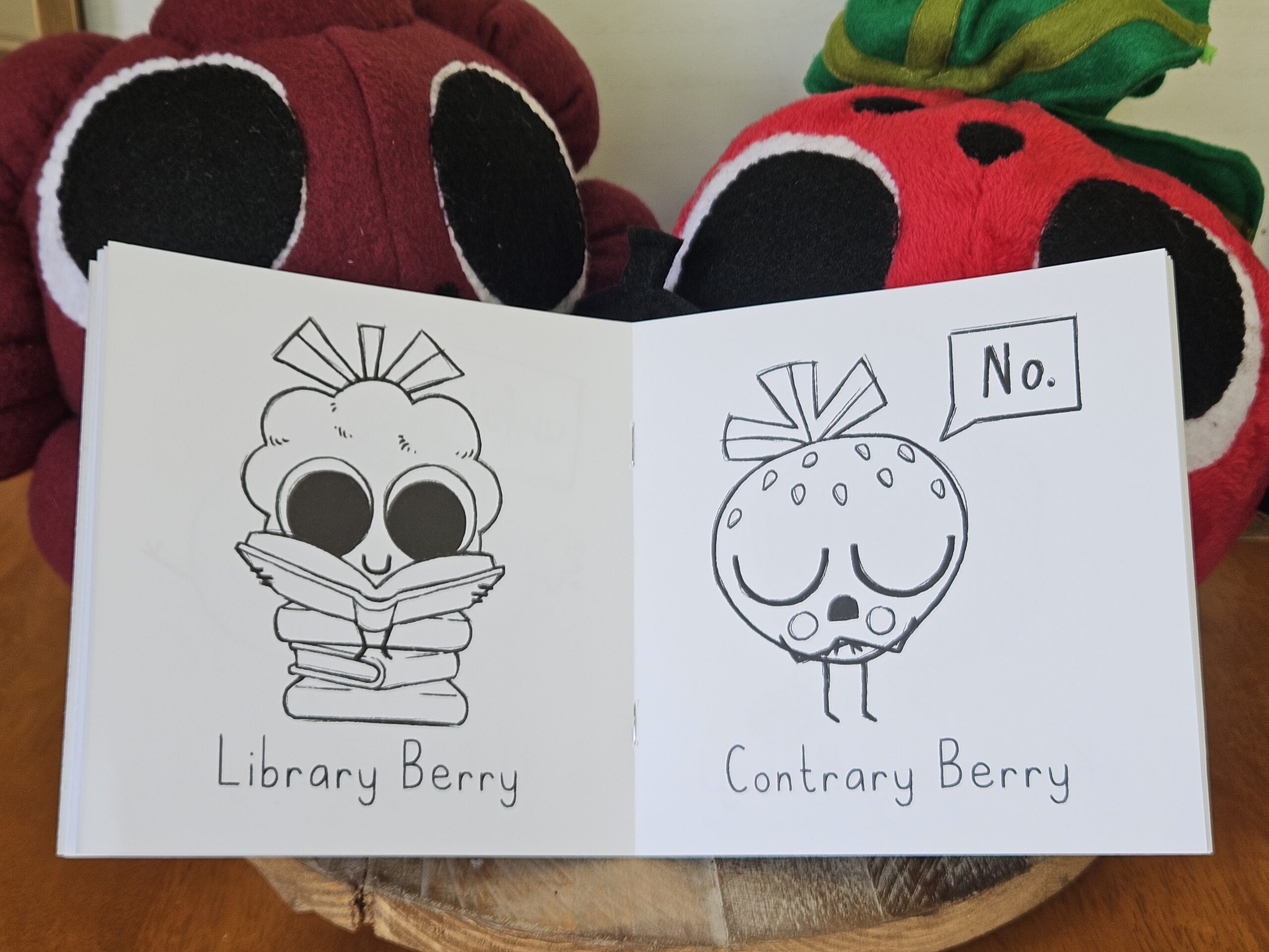 The coloring book features a variety of black and white whimsical berry personalities introducing readers to larger words.
